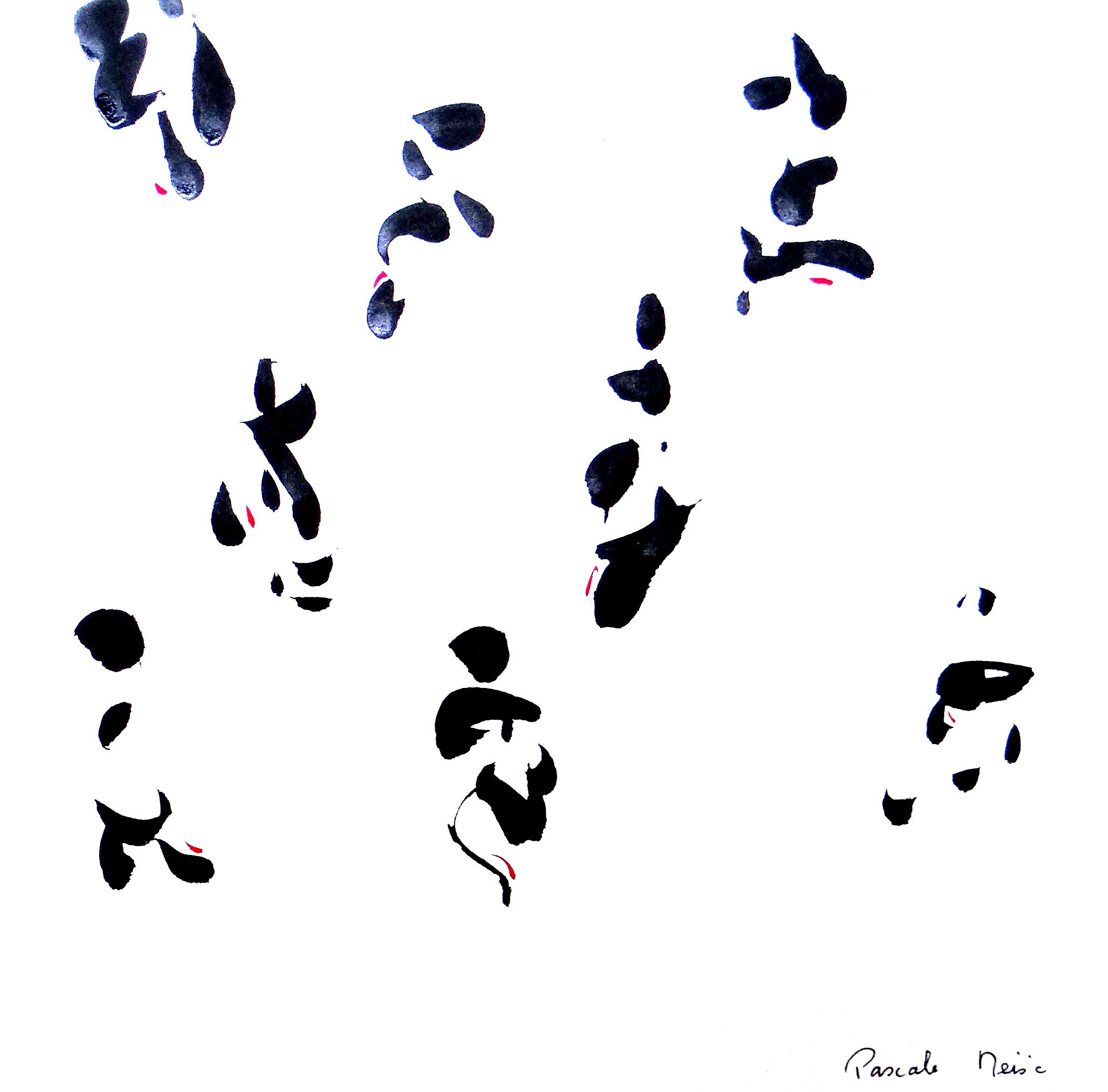 » Pour ce qui est des personnages, ces dessins ressemblent à des calligraphies d’Extrême Orient, ils évoquent pour moi, les mises en scène de danse de Maguy Marin, mais là je suis moins sensible parce que vous faîtes de la représentation, c’est certainement important pour vous d’explorer différents styles, mais du peu que je comprends de votre peinture et donc de vous, l’évasion vers des représentations abstraites vous procure une imagination débordante. Par la même, vous ouvrez les portes de l’oubli et du plaisir dans la contemplation de vos œuvres pour vos admirateurs. J’espère pour vous que le plaisir de peindre n’a d’égal que le bien-être procuré par certaines de vos œuvres à ceux qui les contemplent ».